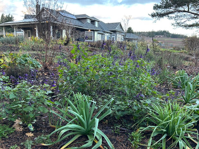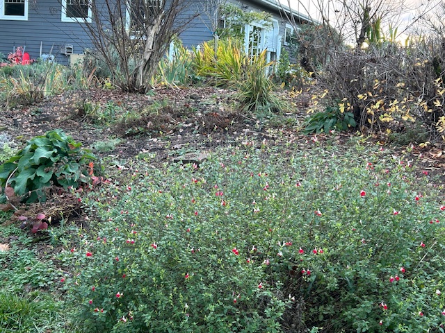 The blue salvia in Bed #2 is still in bloom, although the hydrangeas have mostly lost their leaves.