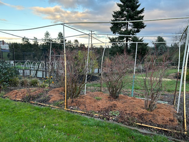 Ever economical, we raked up the fallen pine needles and put them around our blueberries as mulch. The acidity helps keep the blueberries blue.