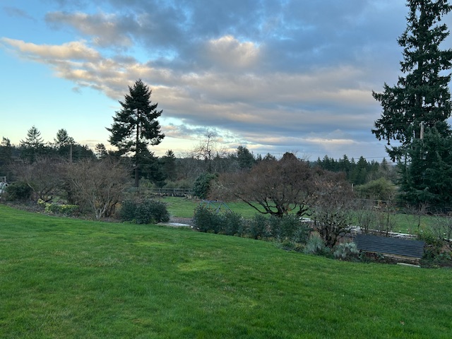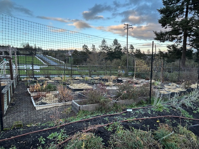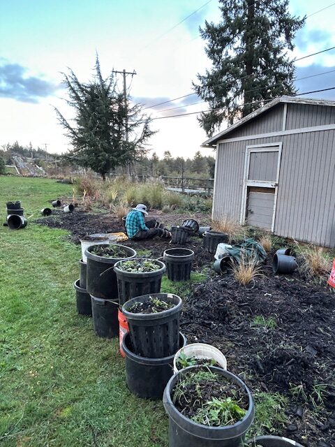 Work in the garden doesn’t stop just because it is December. Gordon’s working hard to keep up with the weeds, in between the many rain storms we’re experiencing in the Pacific Northwest. He takes the filled containers to McFarland’s Bark and returns with a trailer filled with compost.