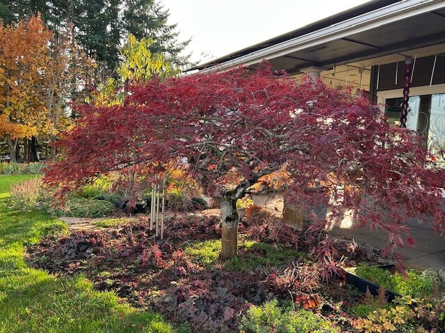 In December, the structure of the weeping Japanese Maple provides architectural interest.