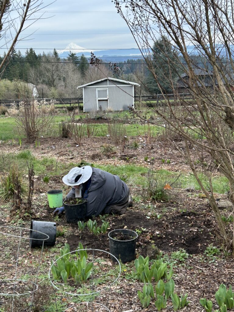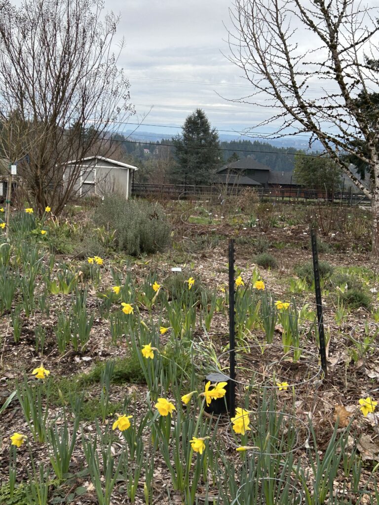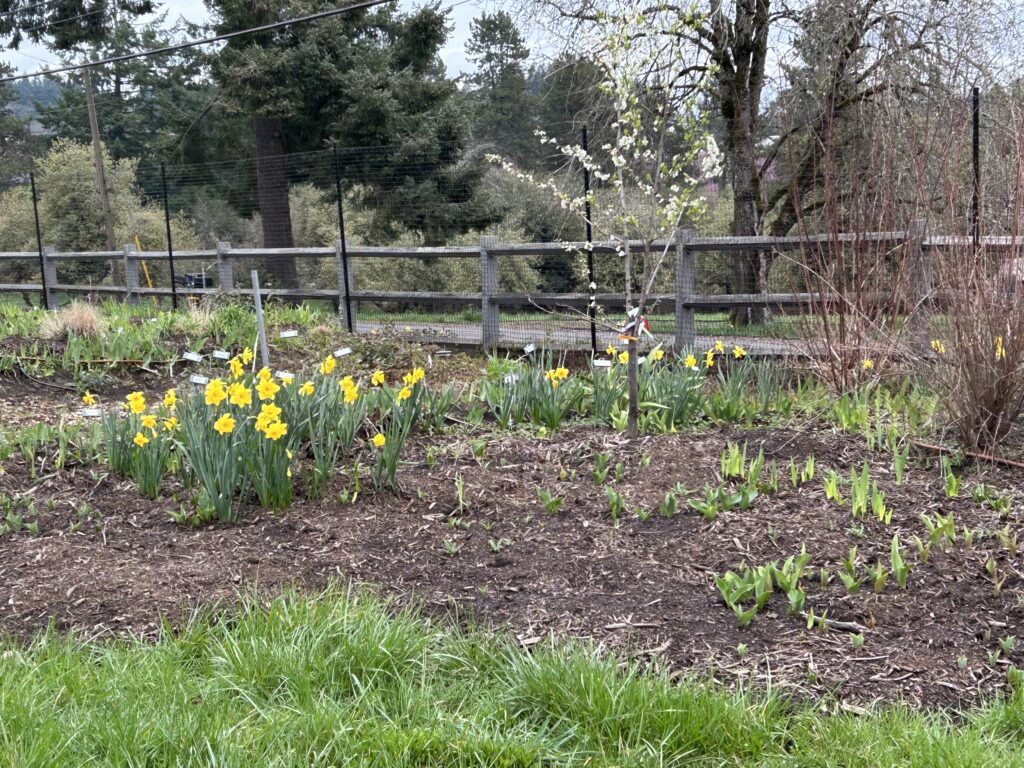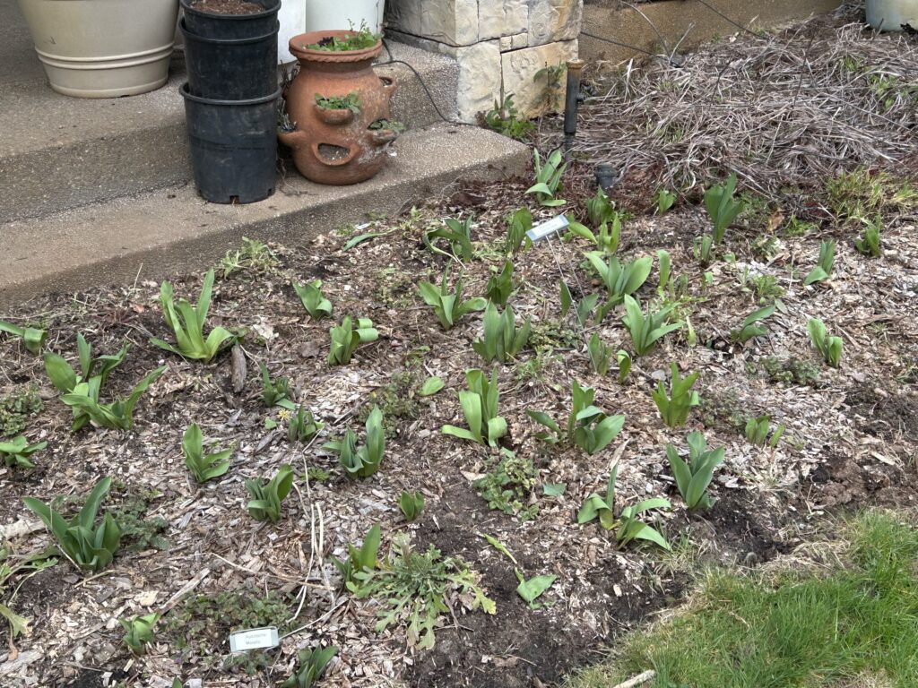 Last year we planted hundreds of tulips. They will be back in bloom in a few weeks– if next week’s snow doesn’t decimate them!