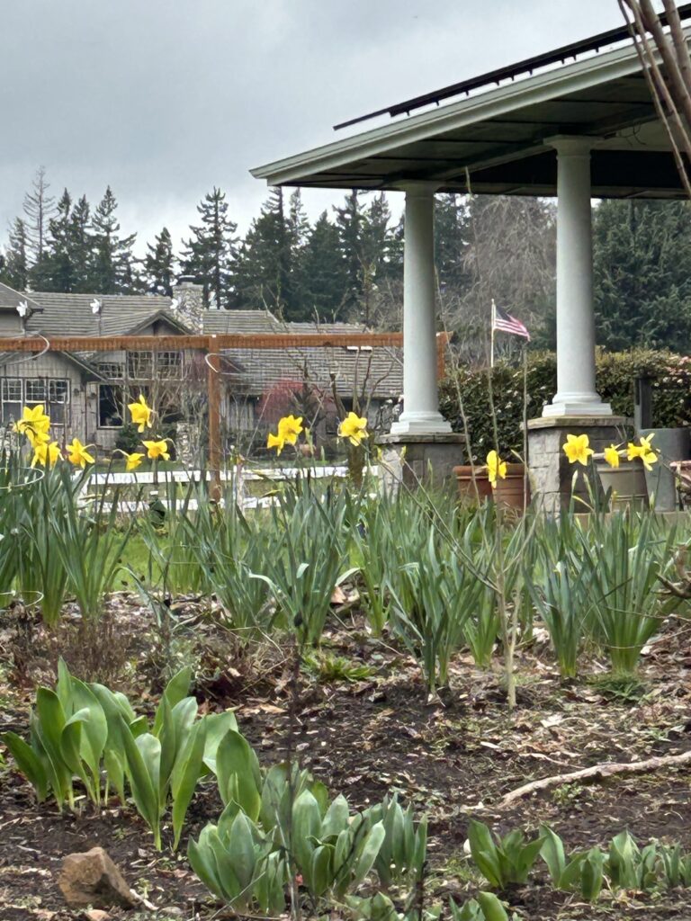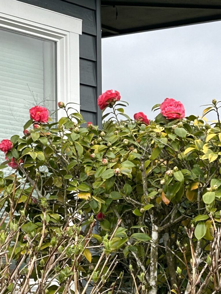 This past week’s warm weather brought the magnolia into bloom! The cherry blossoms at our front gate will not be far behind. They typically bloom in early April, but I think they may bloom in March this year. There’s a rhythm to our blooms–after the magnolias and cherry trees come the rhododendrons, azaleas, viburnum, and early roses. Not yet, but soon….